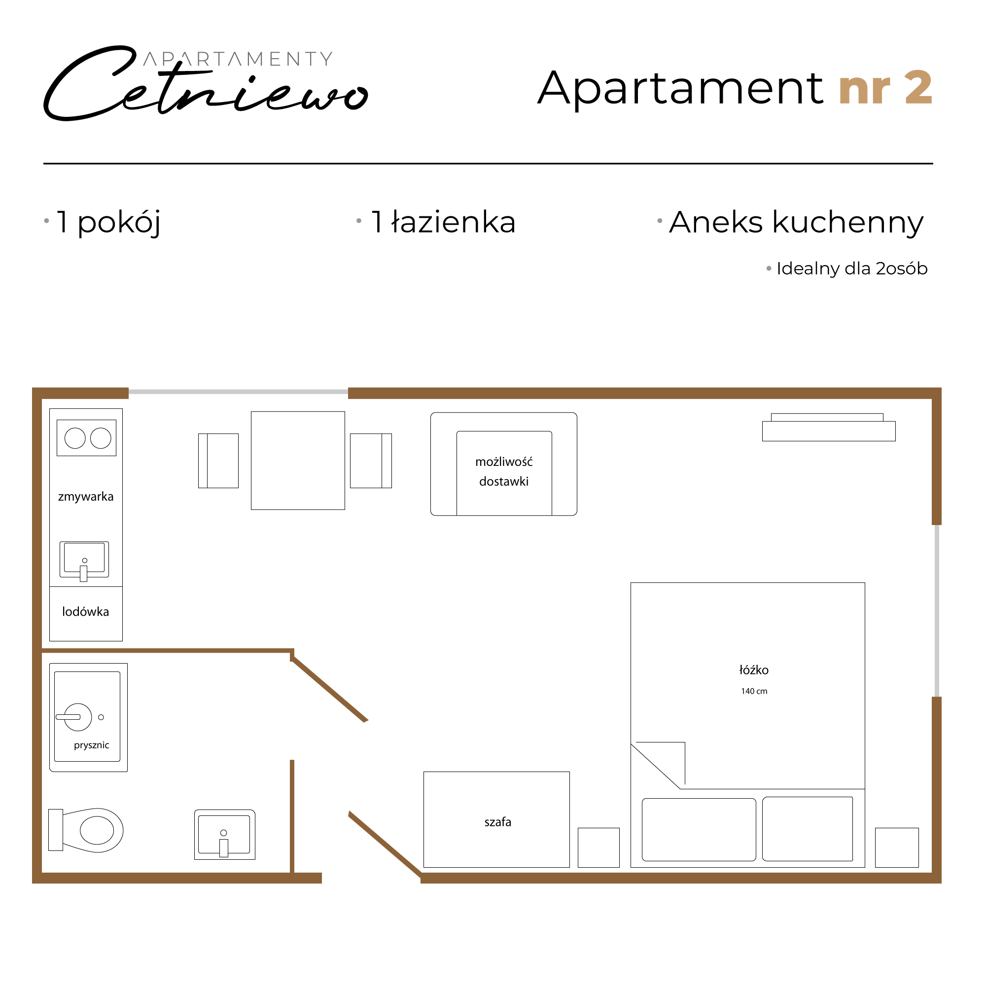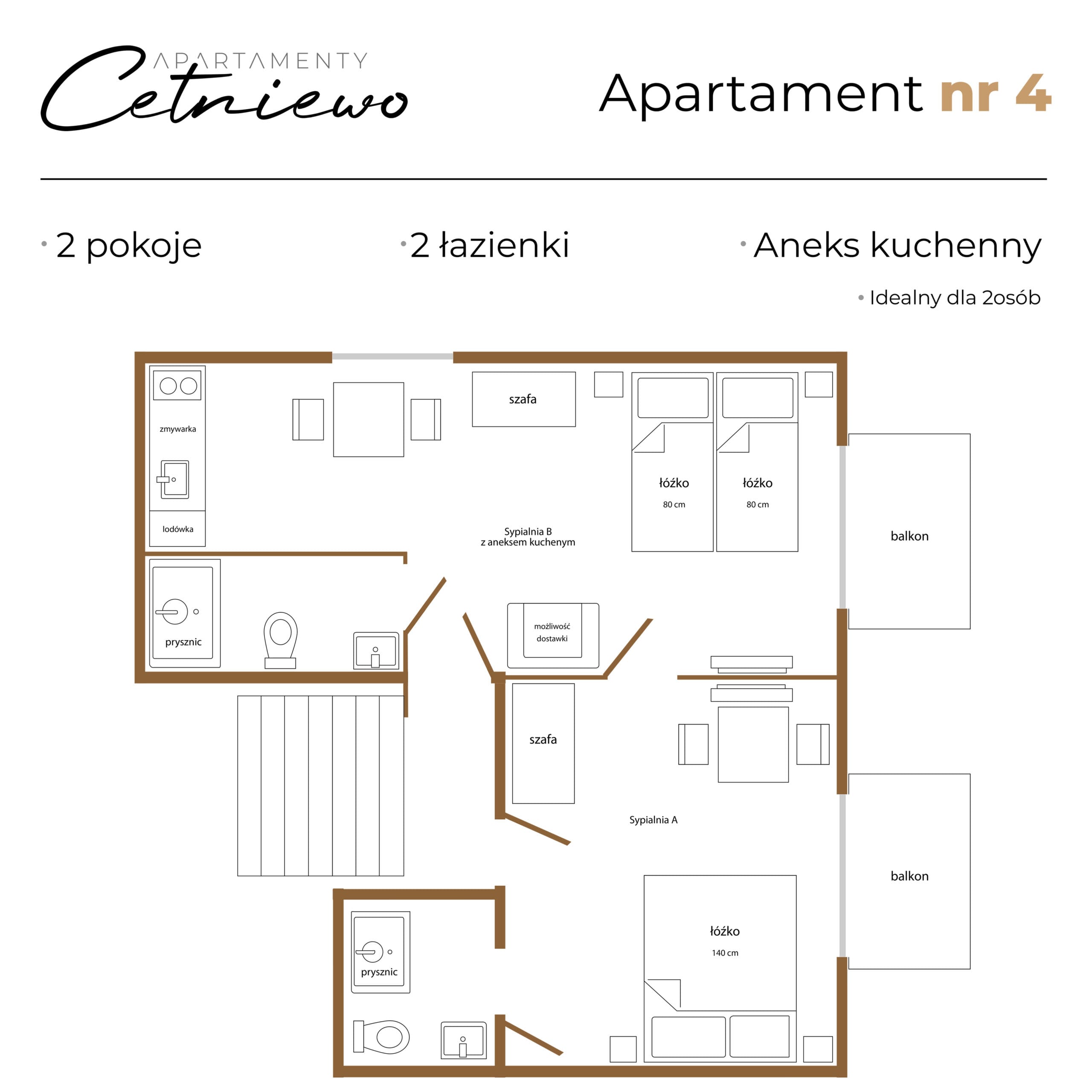 Apartament dwupokojowy typu suite z 2 łazienkami + aneks kuchenny, idealny dla 4 osób, możliwość 1 dostawki, powierzchnia 40m2