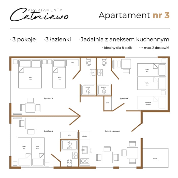 Apartament trzypokojowy z trzema łazienkami + duża jadalnia z aneksem kuchennym, idealny dla 7 osób, możliwość 2 dostawek, powierzchnia 70m2